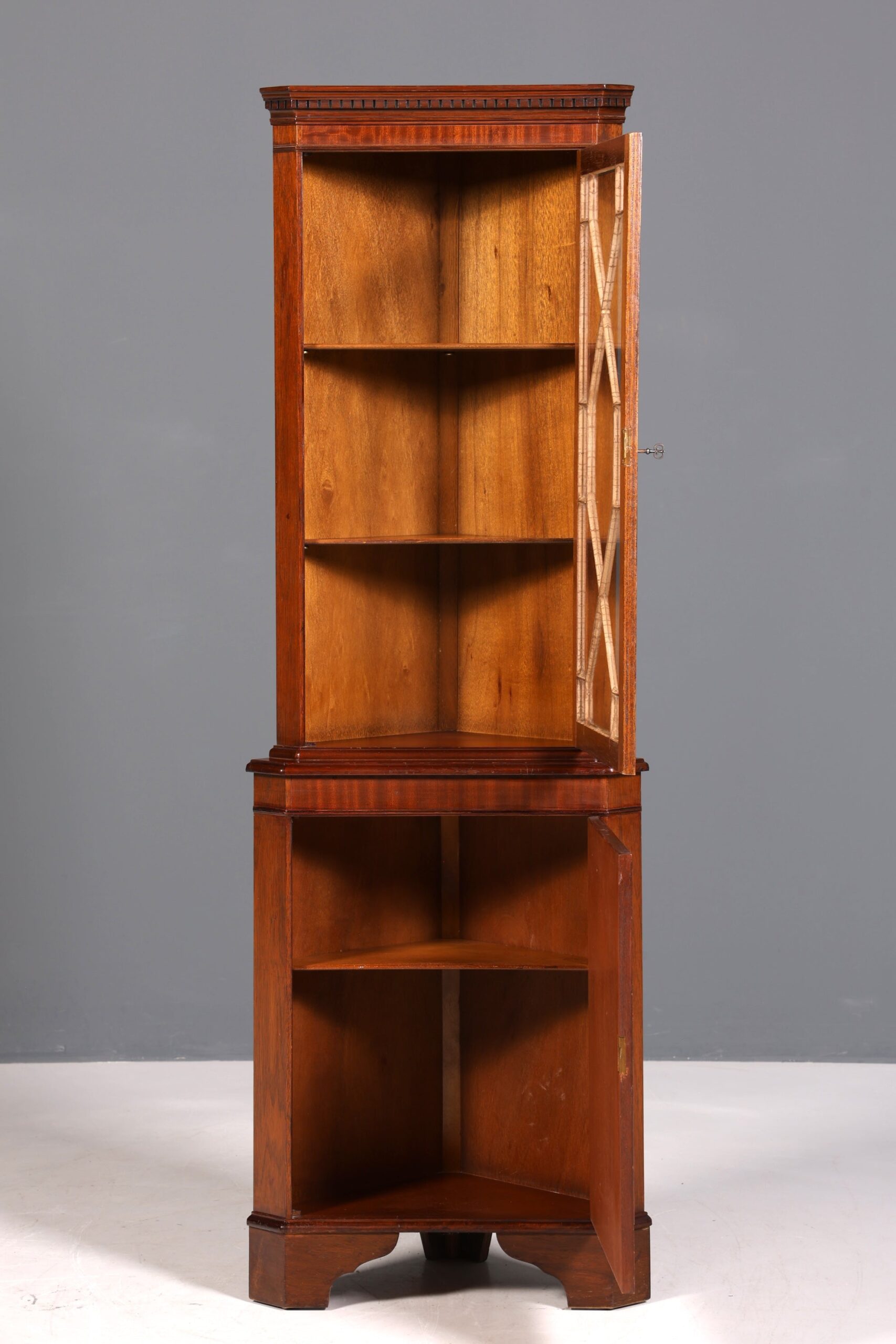 e Englische Eckvitrine Mahagoni Antik 60s echt Holz Schrank Eckschrank Glasvitrine